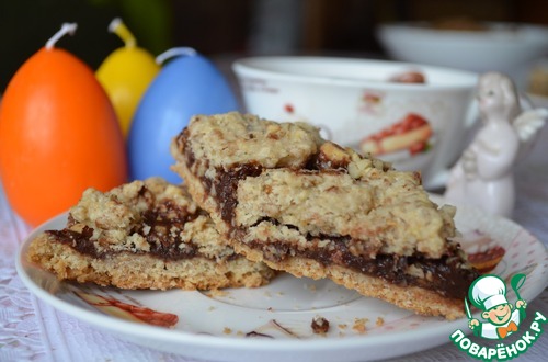 На полупропеченный корж (на горячий) выкладываем карамельный соус, сверху посыпаем его орешками и покрываем пальчиками оставшимся тестом.