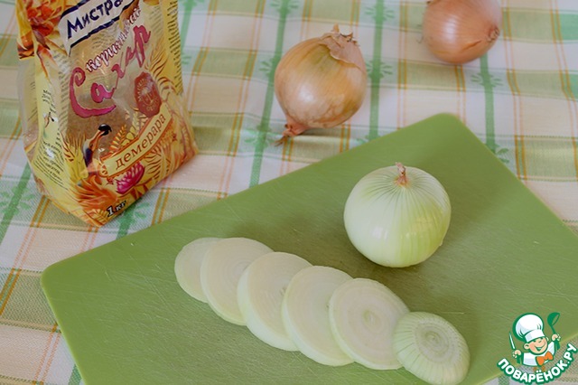 Всё очень просто. Лук режем толстыми кольцами, примерно 0,8 см.