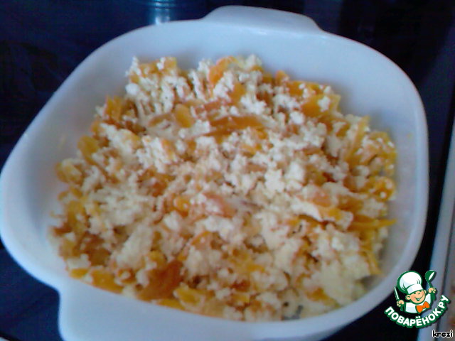 Делаем начинку: курагу помыть, обсушить, нарезать. Добавить курагу к творогу, добавить сахар (можно и больше и меньше, кто как любит).