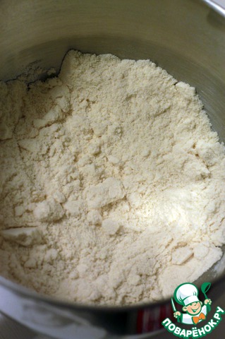 Добавьте в сухую смесь размягченное сливочное масло и размешаете тесто до образования крошки.