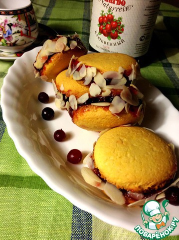 Остывшее печенье намазать щедро клюквенным соусом и склеить попарно. Бока печенья украсить миндальными лепестками, наливать ароматный чай или кофе и наслаждаться нежным хрустящим печеньем
