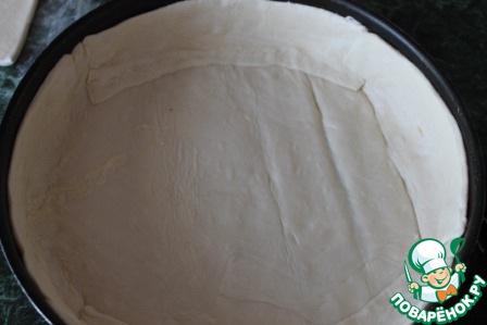 На смазанную растительным маслом форму распределяем тесто, делаем бортики.
