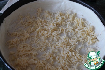На тесто выкладываем половину тёртого сыра.