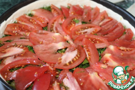 Далее укладываем помидоры, порезанные тоненькими дольками.
