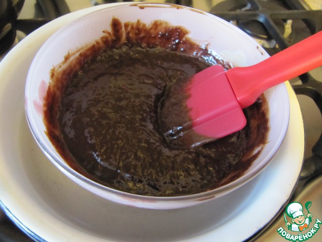 Для ганаша: шоколад растопить на водяной бане. 100 г полученного пюре (150 г грушевых половинок соединить со 150 г пряного винного сиропа. Пюрировать блендером. Процедить!) подогреть и соединить с шоколадом (подогревая и то, и другое, мы добиваемся довольно жидкой консистенции ганаша, который удобно будет вылить в форму ровным слоем). Все размешать до полной однородности, добавить сливочное масло и ликер. Мешать, пока смесь не станет гладкой и блестящей.