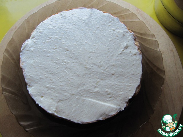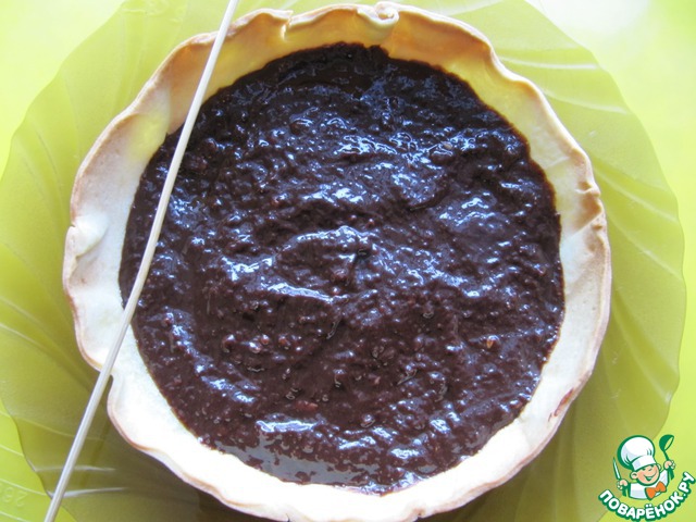 Сразу вылить в подготовленную остывшую основу. Поставить в холодильник. Для сравнения толщины теста положила шпажку.