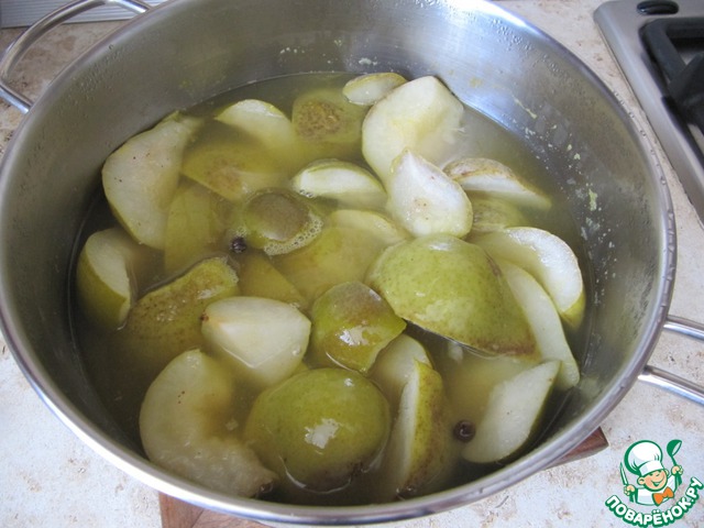 Груши (лучше их подготовить накануне) почистить и нарезать на половинки. Вино смешать с сахаром и специями, довести до кипения.