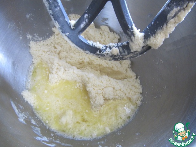 Яйцо разбить венчиком, добавить воду. Размешать до однородности, поставить в холодильник. Затем, достаем охлажденные мучные продукты: муку, смешанную с маслом, превратить в крошку в стационарном миксере - насадкой К (гитара), ножом. Манипуляций с тестом - самый необходимый минимум. Влить яйцо, перемешать на низких оборотах, только чтобы соединилось с тестом.