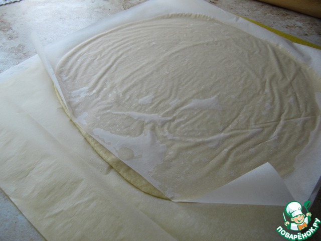 Пекарскую бумагу припылить (совсем чуть-чуть) мукой, выложить тесто, раскатать до толщины 2-3 мм (насколько это возможно), накрыть др. листом пекарской бумаги и отправить в холодильник. Минимум на час. Охлажденное и вылежанное тесто раскатать до толщины - 1 мм (для начинающих - 3 мм!), предварительно согрев его 1-2 мин., пока оно чуть-чуть согреется (только для его пластичности)!