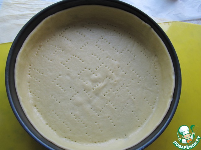 Вырезать круг, на 3-4 см шире дна формы. Перевернуть пекарскую бумагу с тестом в форму. Форму ничем смазывать не нужно. От лишнего масла основа "сядет" слишком сильно.