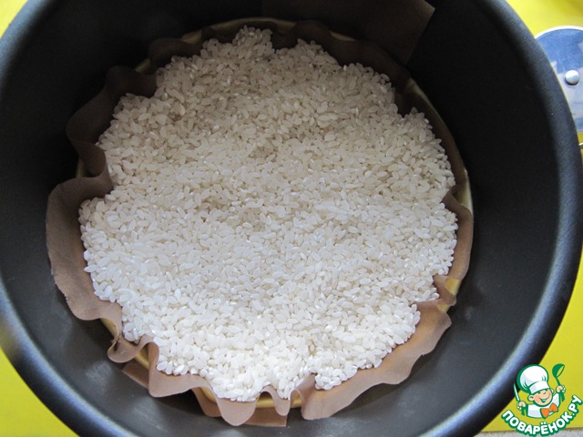 Основу застелить пленкой (для микроволновок) крест-накрест (у меня кончилась и я использовала тонкий тефлоновый лист для выпечки!). Засыпать рисом. Я пекла 2 основы, первую не сфотографировала, вспомнила на второй! Рис закрыть краями пленки, поставить форму в холодильник минимум на час. Духовку разогреть до 170С. Поставить форму в разогретую духовку, выпекать с рисом, пока края основы не зарумянятся. Вынуть, убрать рис, выпекать еще 10-15 минут, или до тех пор, пока вся основа не станет золотистой. Слишком сильно печь не надо, появится горечь. Дать остыть, сначала на противне, потом осторожно переложить на решетку! Он хрупкий!