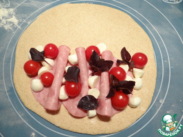 На одну половину круга кладу тонкие ломтики ветчины, помидоры черри, моцареллу, базилик.