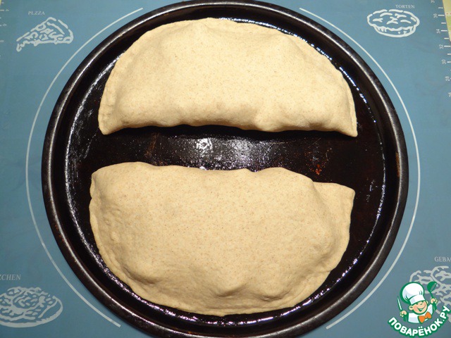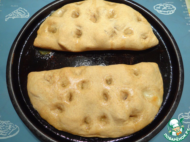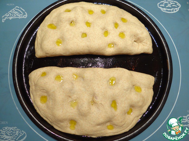 Накрываю начинку второй половиной теста, защипываю край. Таким же образом готовлю вторую фокаччу.