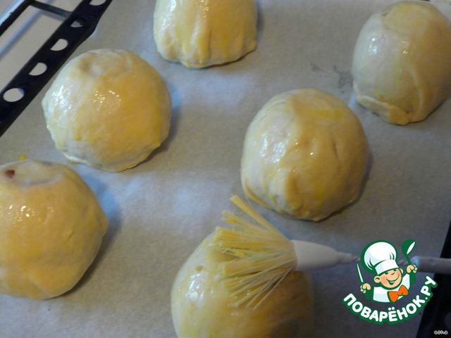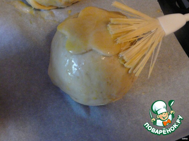 И положить яблочко на противень защипанной стороной вниз и смазать яблочники желтком.