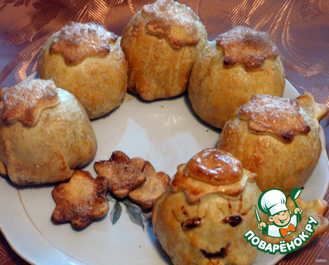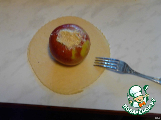Тесто раскатать, вырезать круги по тарелке, на середину положить яблоко, начинить его маслом с сахаром, соединить тесто