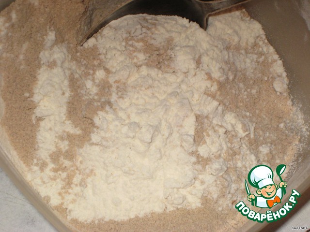 Пшеничную муку просеять с разрыхлителем, смешать с гречневой мукой, щепоткой соли, корицей и ванилином.