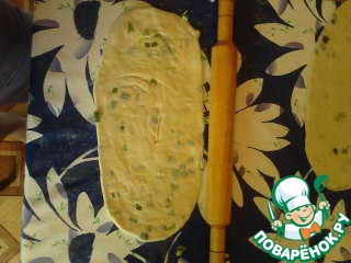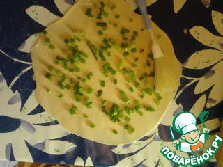 Раскатать тонкую лепёшку, подсыпая немного муки, чтобы не прилипало, равномерно посыпаем половиной чайной ложки соли и проходимся по лепешке скалкой, вминая соль в тесто.