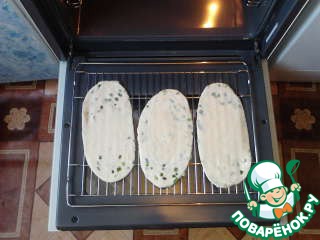 Ставим выпекать в духовку на решетке, на самую большую температуру, у меня в духовке встроенный гриль, поэтому я включала только его на максимум и решетку прямо под гриль, печется минут 5 с каждой стороны (то есть нужно перевернуть 1 раз)
