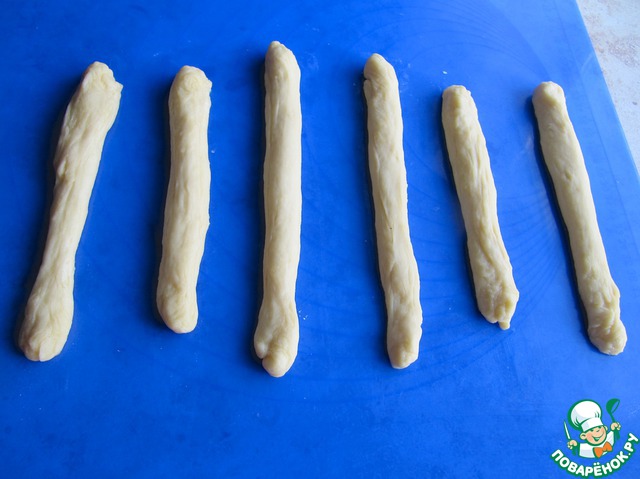 Разделите тесто на 8 частей по 30 г каждый. Раскатайте из каждого кусочка кусочка жгут длиной 15 см на присыпанной мукой поверхности.