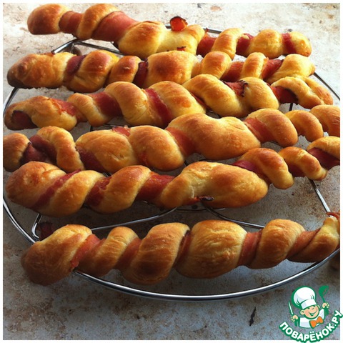 Каждую ленточку бекона я еще разрезала вдоль по длине. Плотно оберните каждый жгут спиралькой из бекона и выложите их на противень на расстоянии 4 см друг от друга, поставьте в теплое место на 30 минут, чтобы тесто поднялось. (Фото нет, так как забыла снять, такое бывает иногда).