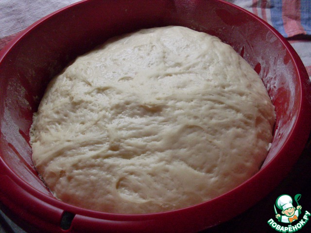 Смешиваем теплое молоко с дрожжевой смесью. Добавляем муку, соль, яйцо, масло. Перемешиваем, накрываем, ставим в теплое место на 3-4 часа. За это время один раз обмять.