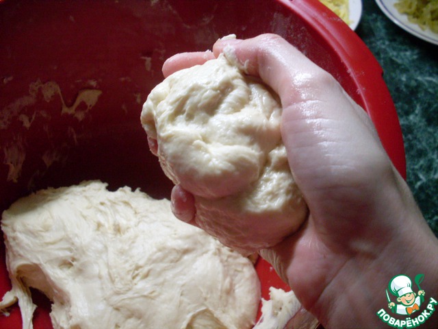 Чтобы тесто не прилипало, можно руки обильно смазать раст. маслом.