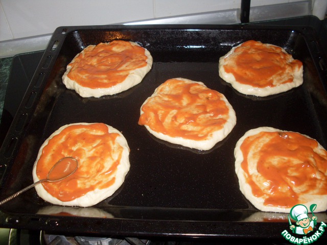 Получившиеся лепешки смазываем помазкой, оставляя от края 1 см непромазанного теста.