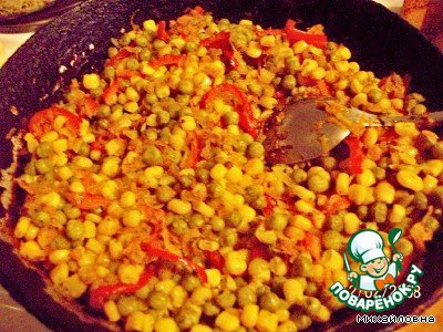 Лук, чеснок, морковь, перец, майоран, анис жарить на среднем огне 10 мин. Добавить сладкий перец, кукурузу, горошек и жарить ещё 6-8 мин.