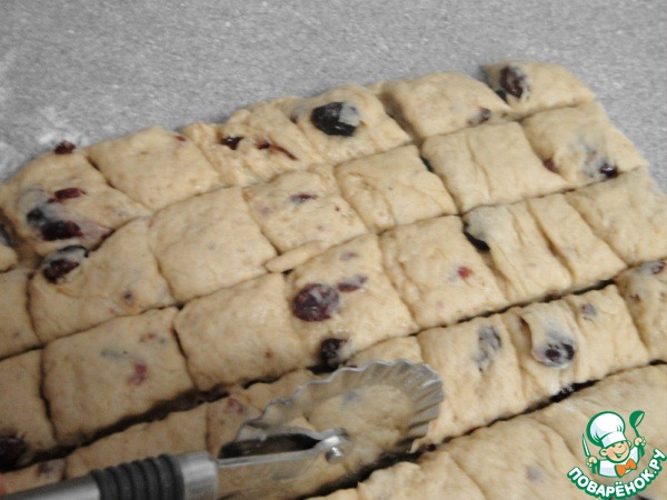 Выложить тесто на посыпанный мукой стол и раскатать его примерно толщиной 2-3 см. Нарезать на кубики 6 Х 6 см. выложить на противень и поставить выпекать в духовку при 180°C, примерно мин.20.