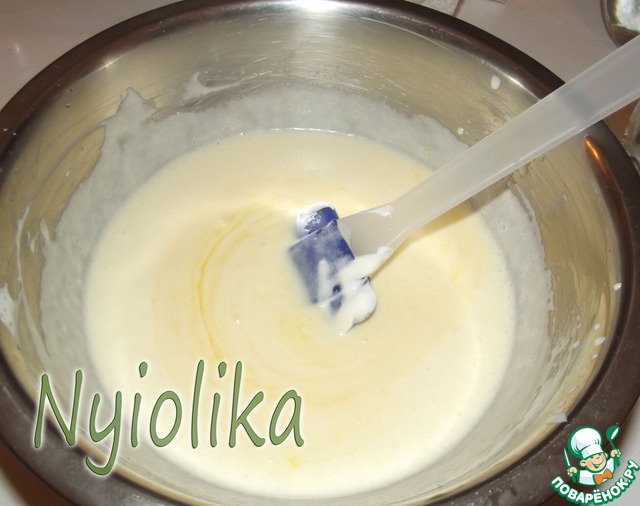 Смешать растопленное сливочное масло, сметану, сахар, соль, добавить соду, погашенную уксусом или разведенной лимонной кислотой, тщательно перемешать до полного растворения сахара и соли. Вмешать 1 яйцо.