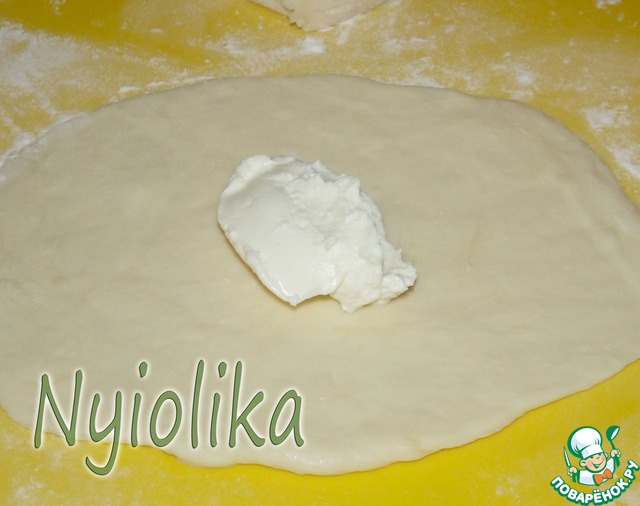 Тесто разделить на 9 частей. каждый колобок раскатать в овал, в середину выложить начинку.