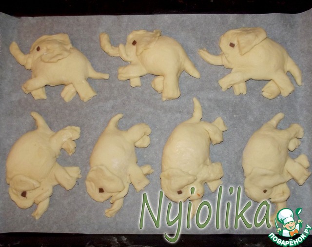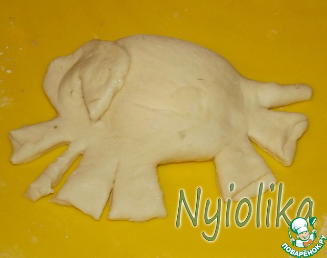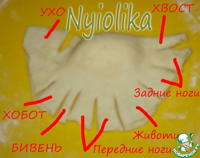 Сложить пополам, слегка обмять вокруг начинки и сделать надрезы: ухо, хобот, бивень, передние ноги, животик, задние ноги, хвост.