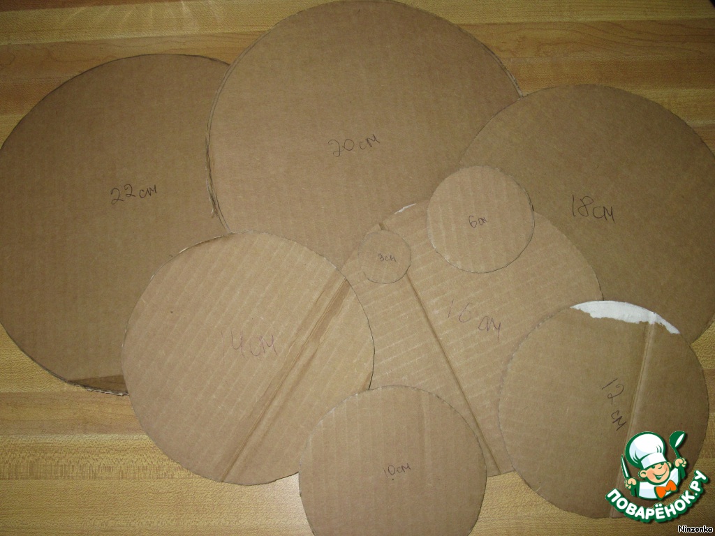 Сначала делаем шаблоны звезд. Для этого надо вырезать круги диаметром 22см, 20см, 18см, 16см, 14см, 12см, 10см, 6см и 3 см.