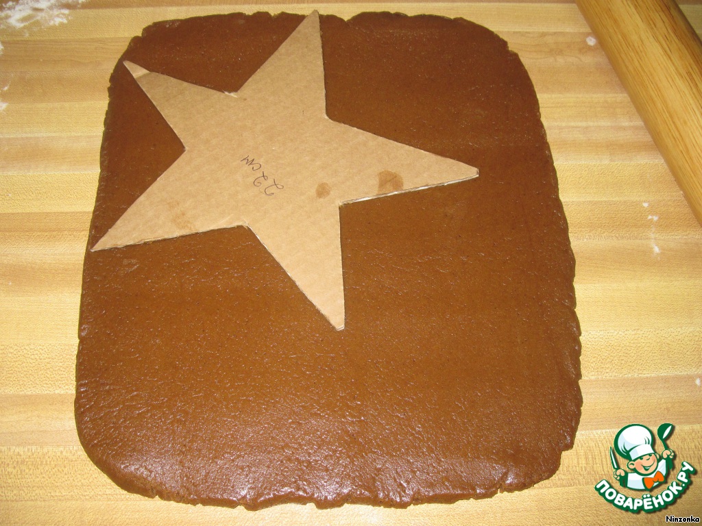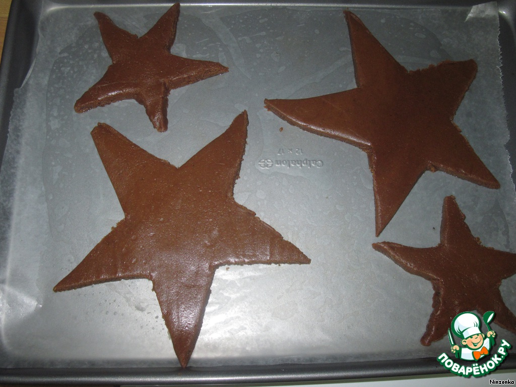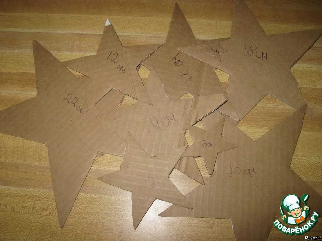 Раскатать тесто толщиной 4 мм. По шаблонам вырезать звездочки. Лучше это делать сразу на вощеной бумаге, на которой будете выпекать, чтобы звезды не рассыпались. Вырезаем 1 звезду 22см, 2 - 20см, 1-18см, 2-16см, 1-14см, 2-12см ,1-10см, 2-6см и 1-3см. Из оставшегося теста вырезаем круги диаметром 4 см.