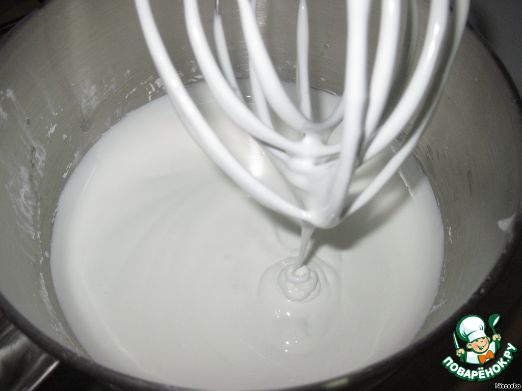 Теперь делаем айсинг: взбиваем сахарную пудру с яичными белками миксером на небольших оборотах не менее 15 минут. Масса должна быть тягучей.