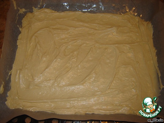 На смазанный подсолнечным маслом противень выкладываем половину теста, и разравниваем его ложкой. Слой теста должен составлять около 1 см.