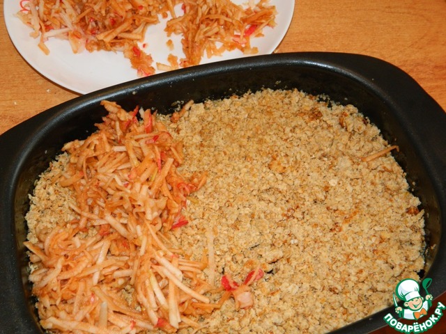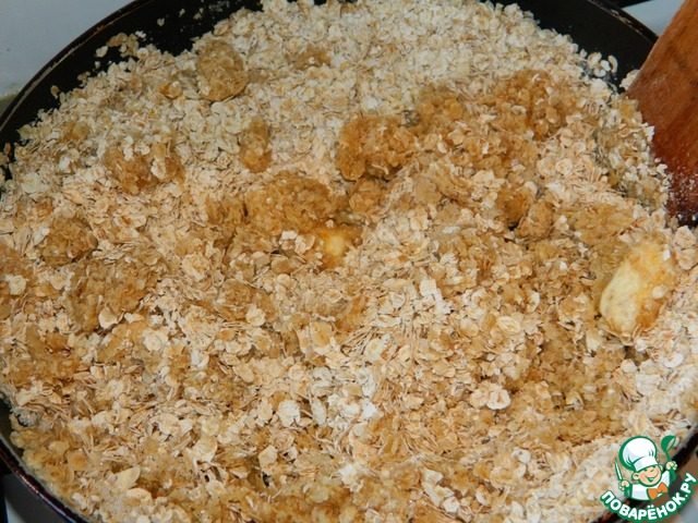 В смазанную маслом форму выкладываем хлопья, а сверху яблоки.