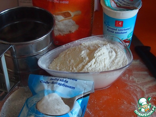 Постепенно добавить просеянную муку, в процессе замешивания три раза добавить по щепотке соды. В рецепте указано 2 стакана муки, у меня всегда уходит 3 стакана, так что смотрите по обстоятельствам, мука бывает разная.