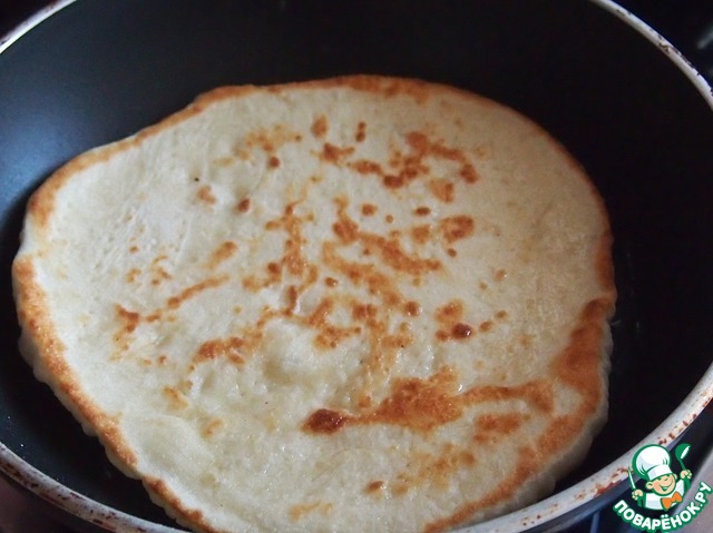 Как только лепешка зарумянилась с одной стороны, а это происходит очень быстро, лепешку перевернуть и жарить с другой стороны.