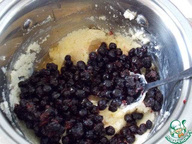 Масло взбить с сахаром. Добавить лимонный и черничный джем и мороженную чернику. Перемешать так чтобы ягоды остались целыми по возможности.
