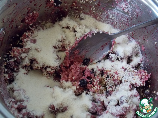 Добавить кунжут, манку перемешать. Положить муку и замесить тесто.