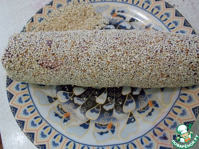 Скатать из нее колбаску. Покатать ее в кунжуте, чтобы она полностью покрылась. Убрать в морозилку на 30-40 мин., чтобы она подмерзла. (Удобнее резать)