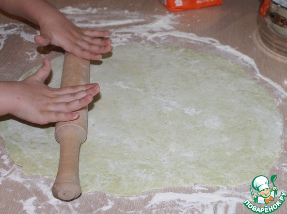 Итак, начнём. В посуду вылить воду, в нашем случае это тархун (любимый Сашин напиток). Потому тесто зеленоватого оттенка. Через сито высыпать муку и добавить сахар. Размешать, вымесить на столе и раскатать. Тесто к столу и рукам не липнет, что немаловажно при готовке с ребёнком. Раскатать в тонкий пласт.