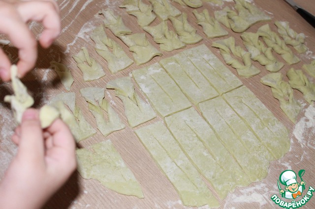 Нарезать полосками, в каждой сделать разрез. Через разрез вывернуть один конец. Если полоска длинная вывернуть дважды.