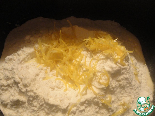 Далее добавляем цедру и разрыхлитель. Ставим чашу в хлебопечь и включаем режим выпечки из пресного теста. В моей хлебопечи он называется "Пирожное". Время 1 час 20 минут.
