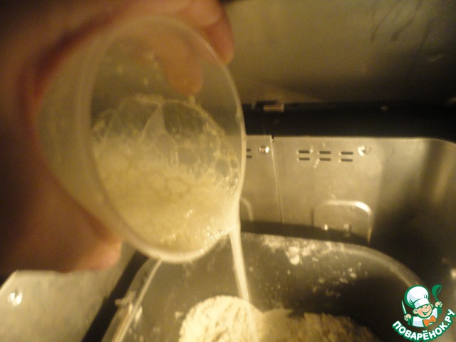Заливаем жидкость с гашеной содой в уже мешающую тесто хлебопечь.