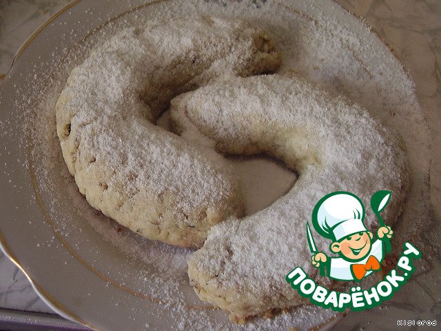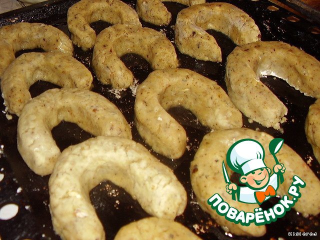 достаем и посыпаем смесью из сахарной пудры и ванилина, пока рогалики еще теплые