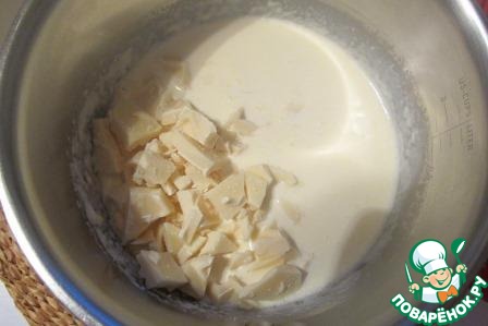 Шоколад рубим на кусочки, сливки доводим до кипения и всыпаем шоколад.