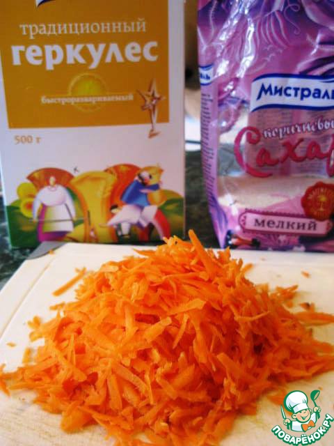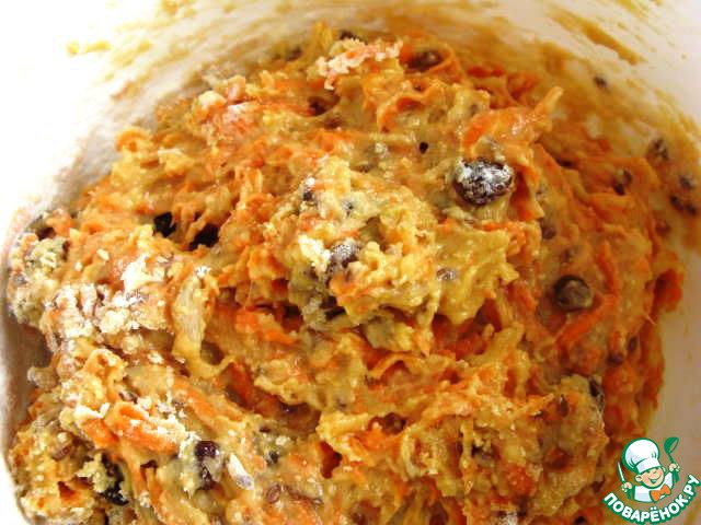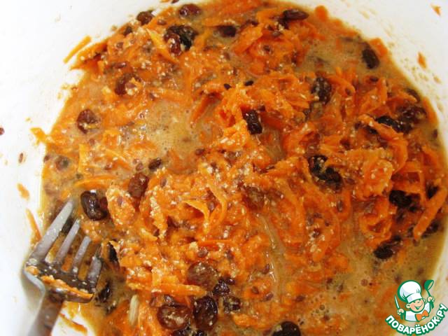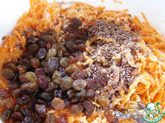 Смешать морковь, овсяную муку, соль, сахар, разрыхлитель, семя льна, изюм.