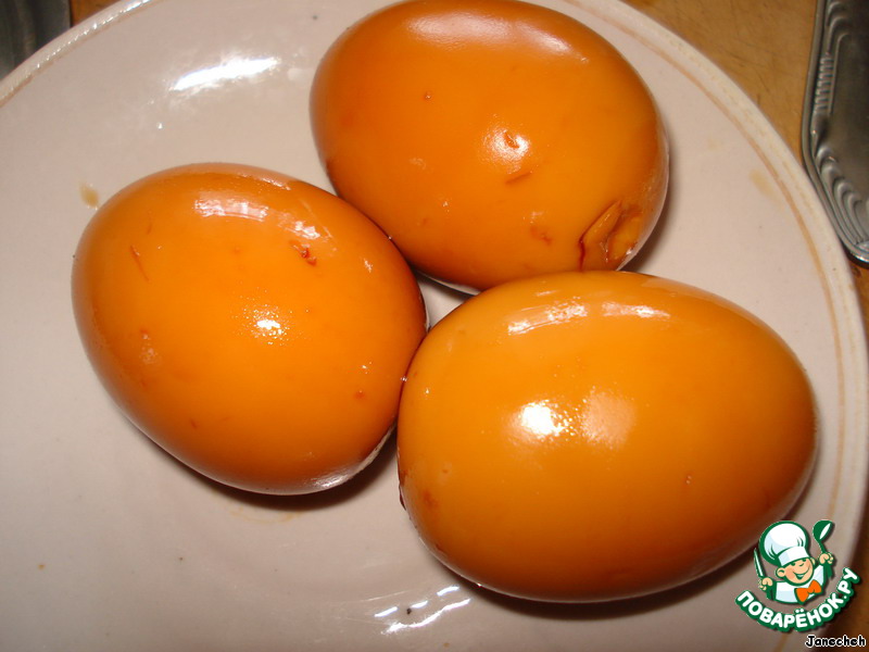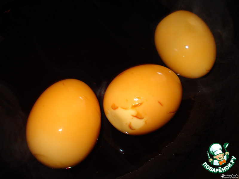 Вылила соевый соус в небольшую кастрюлю. Разогрела его на сильном огне, когда соус начал немного пениться, уменьшила огонь до среднего и положила в кастрюлю яйца. Аккуратно поворачивала их в кастрюле, чтобы соевый соус обмазал яйца со всех сторон. Яйца поворачивала, пока они не приобрели коричневый цвет, и соус выпарился, а на дне остался густой осадок.